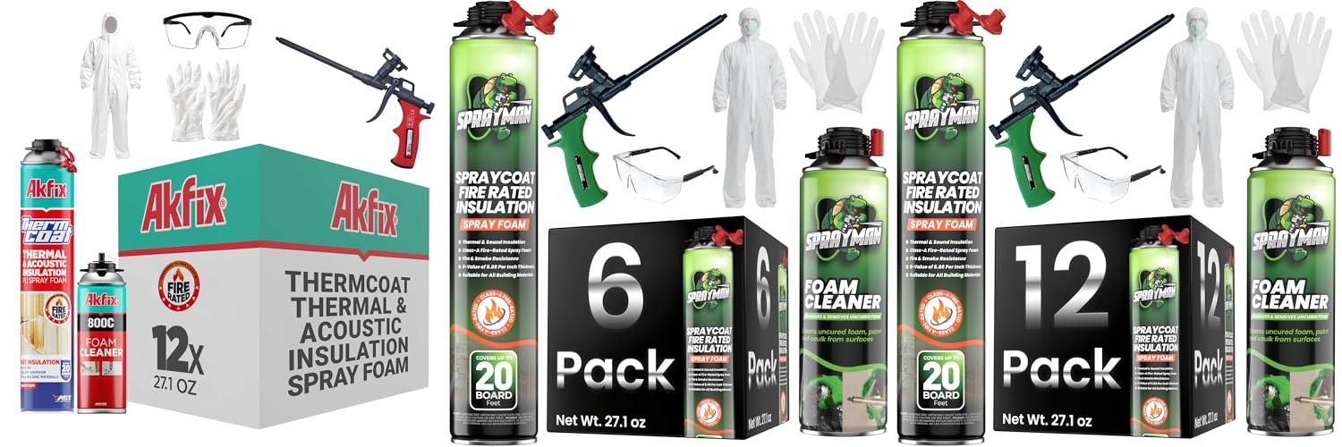 1. Akfix Thermcoat Fire Rated Spray Foam Insulation Kit 240 sq ft (12×27.1 oz.) – (R-Value 11.32 / 2 in) Closed Cell Expanding Wide Sealant Thermal Insulation for Walls and Attic – Gun & Cleaner Included